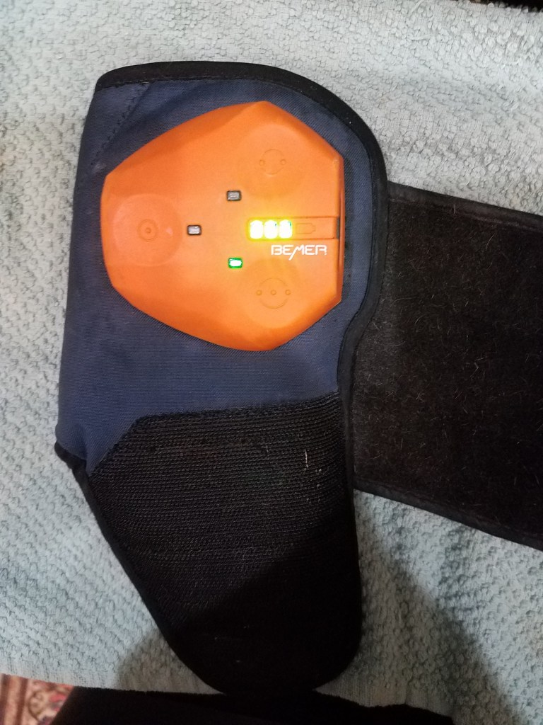 This BEMER cuff is wrapped around the injury and emits a low-level electro-magnetic pulse for 5, 10 or 15 minutes
