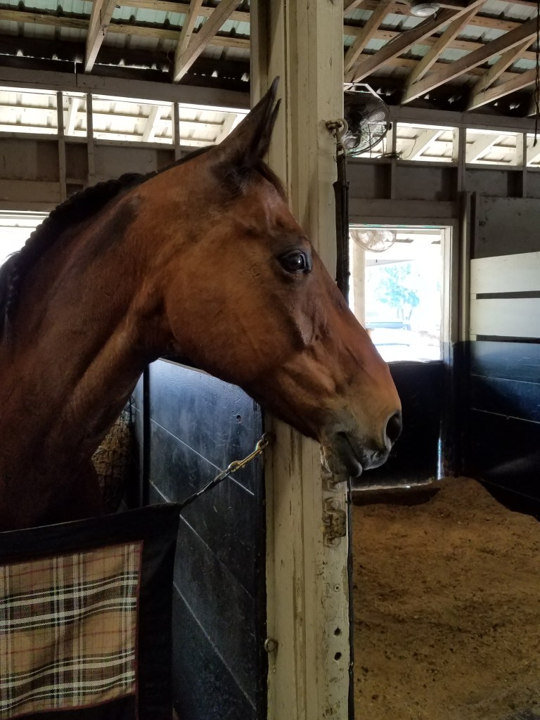 He’s at a barn where his stall is twice the size of his previous one and makes his life much more bearable – with two windows looking over the polo field!